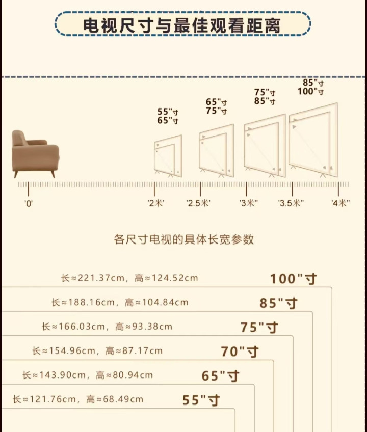 选尺寸前,要先确定沙发墙到电视墙的距离,再对照上方数据进行选择即可。