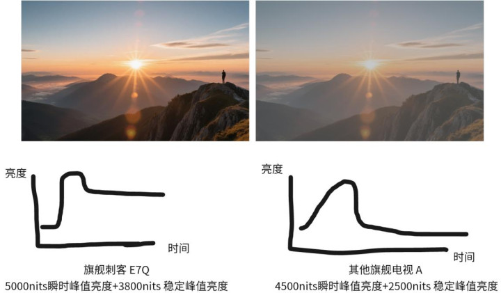比如看日出的延时摄影时,太阳的亮度就是持久高亮的典型场景,只有瞬时峰值够高才能欣赏到拨云见日瞬间的震感,而稳定峰值亮度够高可以让太阳持续升起过程中的壮观被一点点记录下来。
